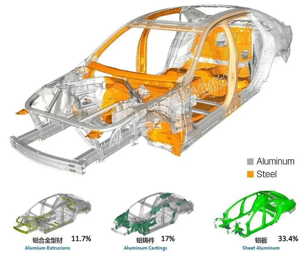 现在越来越多的汽车公司开始应用钢铝混合车身骨架结构,使用铝型材、铝冲压件、铝铸件,以及碳纤维等工程塑料和复合材料类部件,结合各种超高强度钢板,替代传统钢板构件或组件,实现车身框架结构的轻量化和高强度。