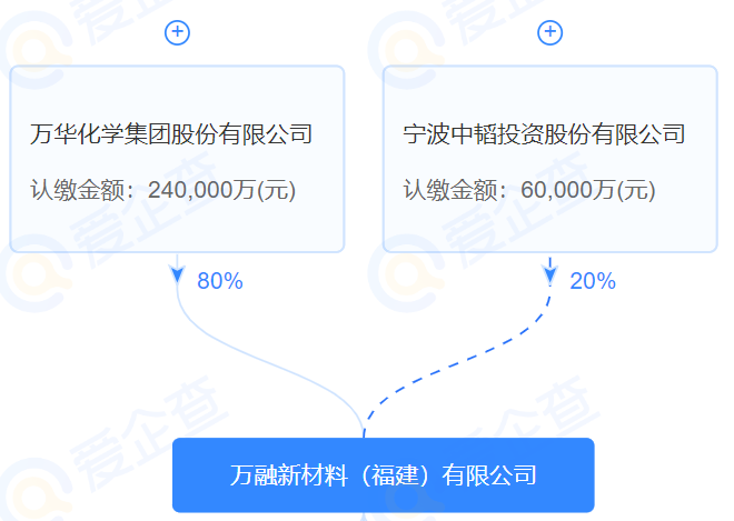 从爱企查官网所知,万融新材料(福建)有限公司属于万华化学控股子公司,注册时间为2021年3月31日,注册资金30亿元,注册地址位于福建省福州市福清市江阴工业集中区,万华化学、宁波中韬两家企业控股,其中万华化学占股80%。