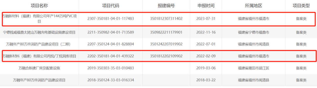 另外,从福建省投资项目在线审批监管平台得知,万融新材料还有“年产144万吨PVC项目”、“丙烷/丁烷洞库项目”这两个项目分别于2023年7月31日、2022年2月9日进行了项目备案。